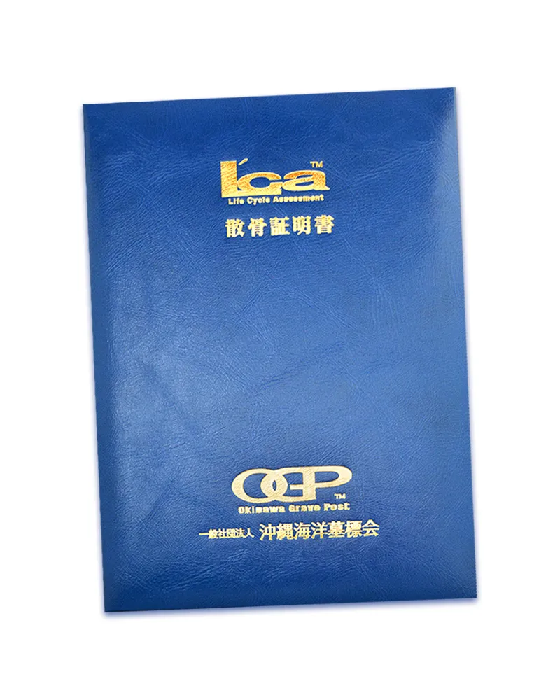 沖縄海洋墓標会オリジナルのカバーに、海洋葬実施証明書と実施の様子を撮影しました写真をセットしてお渡しいたします。