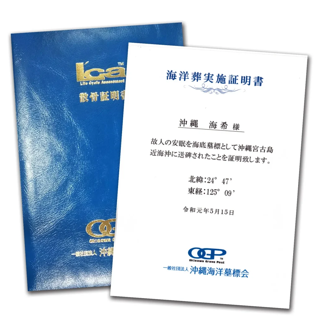 後日、故人様のお名前、海洋葬を行った日付、葬碑の際に測定しました場所(船舶搭載GPS特定)の北緯・東経を記した海洋葬実施証明書を発行いたします。