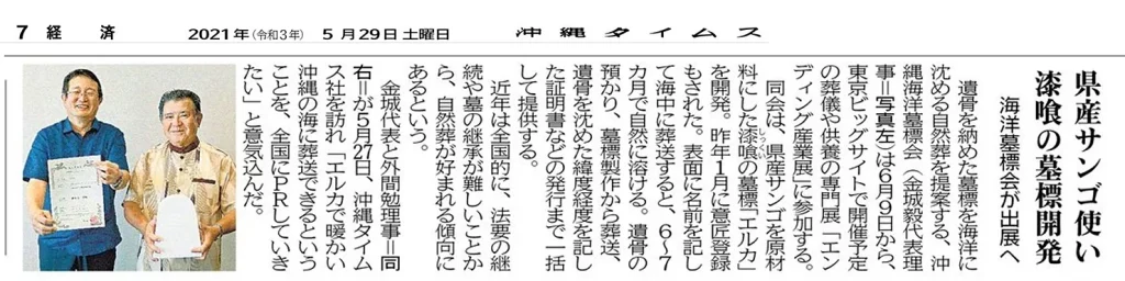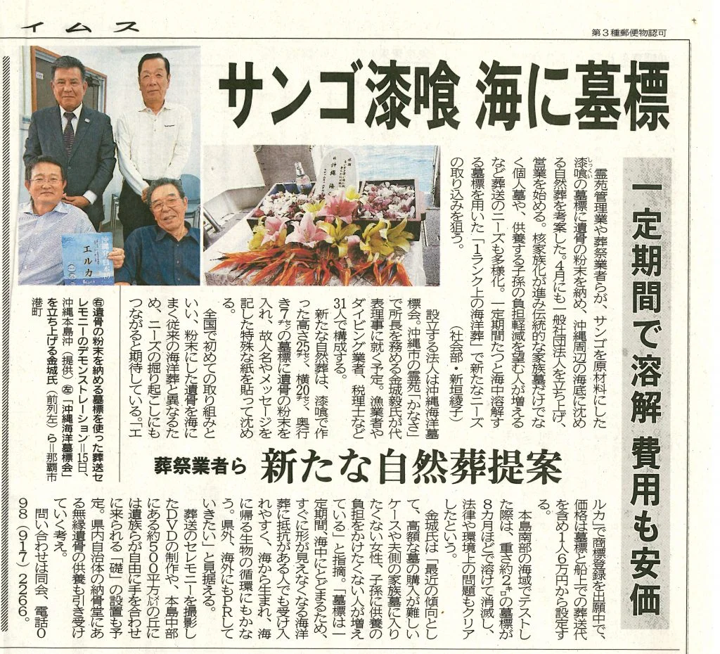 沖縄タイムスの経済面に一般社団法人沖縄海洋墓標会の記事が掲載されました!